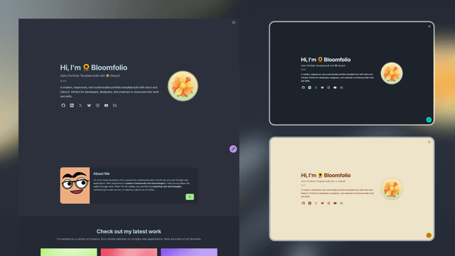 Astro portfolio template with 🌼 Daisy UI. A modern, responsive, and customizable portfolio template built with Astro and DaisyUI. Perfect for developers, designers, and creatives to showcase their work and skills.